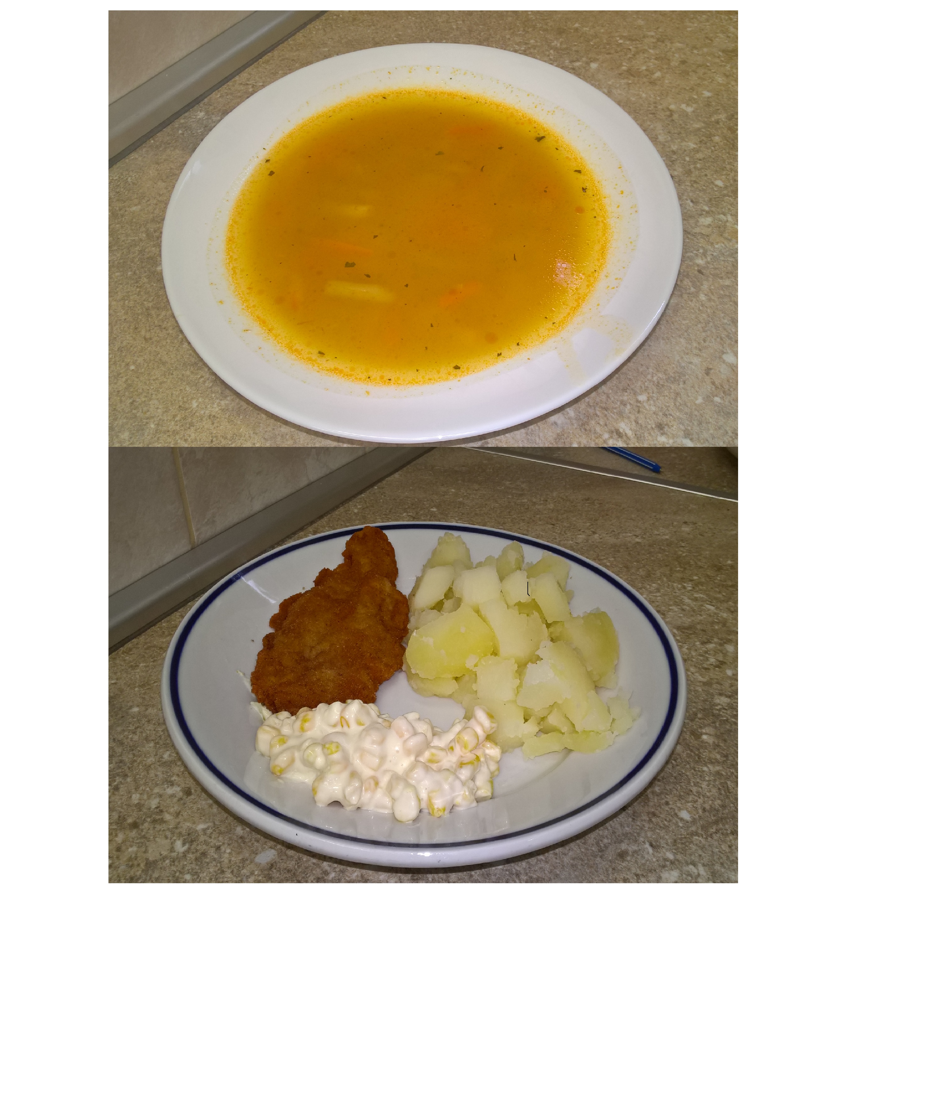 Zöldbableves magyarosan Sárgahüvelyű bab (mirelit) Vöröshagyma Fokhagymagerezd (mirelit) Sárgarépa Petrezselyemgyökér Őrölt feketebors Zöldpaprika Étolaj Finomliszt Csemege fűszerpaprika Petrezselyemzöld Só Levestészta Rántott hal, főtt burgonya Cápaharcsafilé (mirelit) Halak fűszerkeverék Finomliszt Tojás Tej 1,5% Zsemlemorzsa Étolaj Burgonya Kukoricasaláta Csemege morzsolt kukorica (mirelit) Majonéz Mustár Tejföl 12% Porcukor Citromlé Só