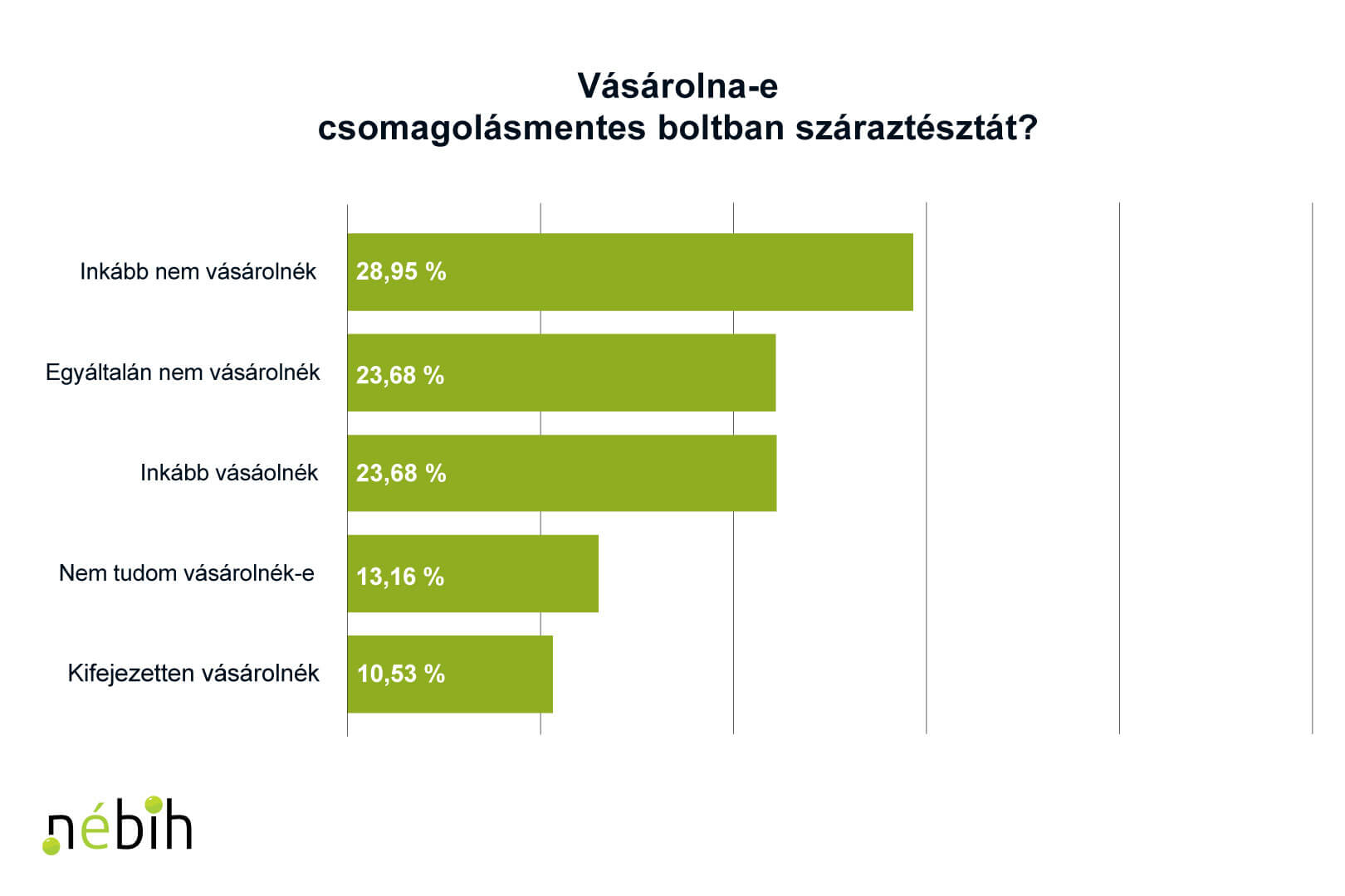 Manapság egyre többen odafigyelnek a környezettudatosságra. Ennek következményeként létrejöttek a csomagolásmentes boltok, ahol sokféle termék mellett száraztészták is kaphatóak. De vajon fontos-e annyira a környezetbarát szemlélet, hogy hajlandóak legyünk lemondani a csomagolásról? A kérdőív segítségével megpróbáltuk erre is megtalálni a választ. A megkérdezettek többsége, 28,95 %-a nem szívesen vásárolna száraztésztát csomagolásmentes boltban és csak 10,53 % élne a csomagolásmentesség lehetőségével.