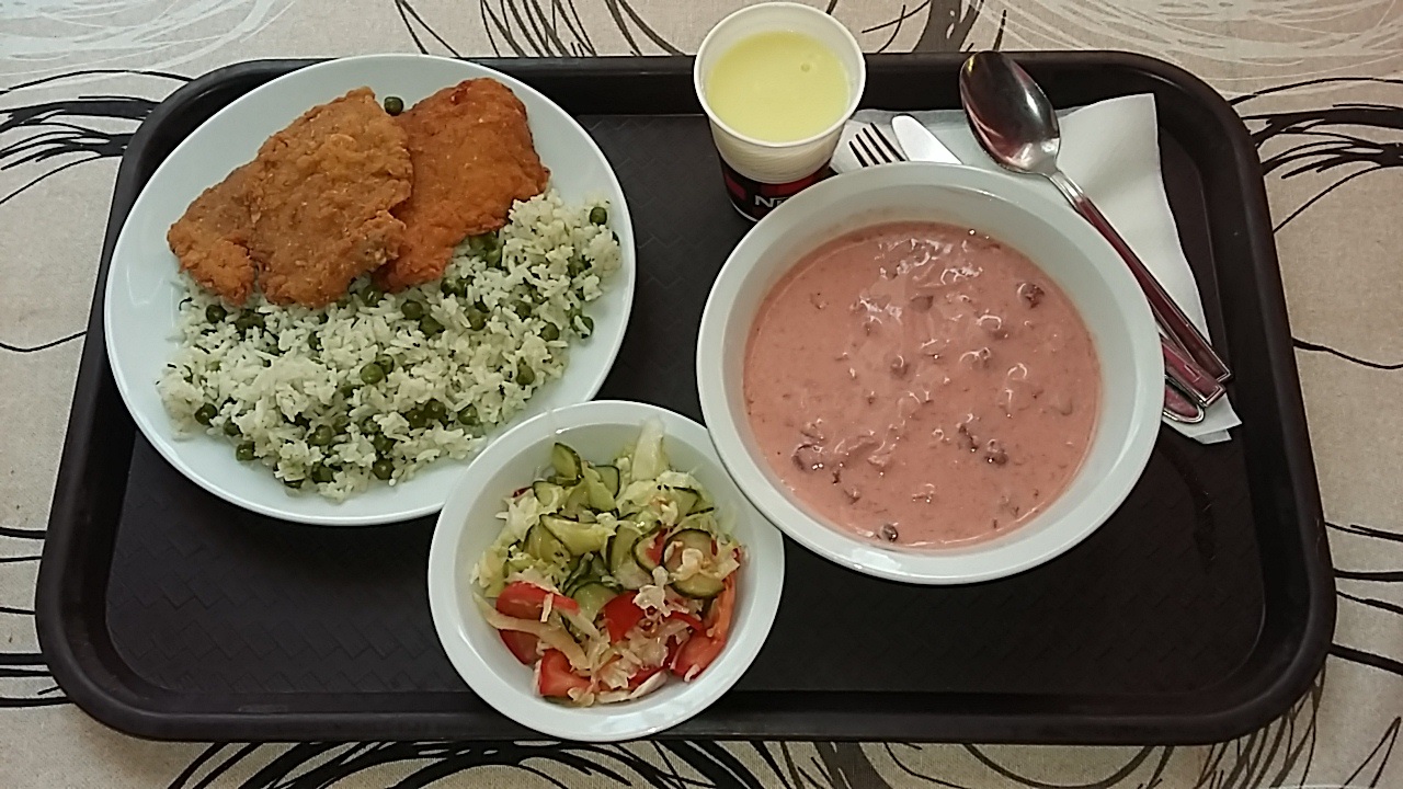 Menü: Gyümölcsleves, Rántott sertésszelet rizibizivel,