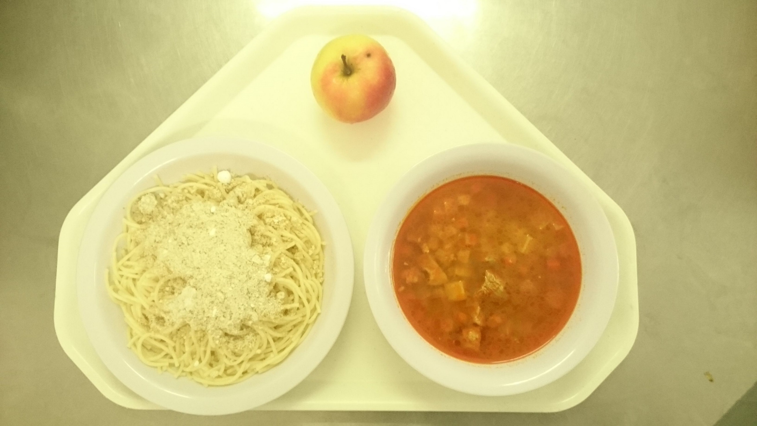 | Állomány: | Az alaplé hígan folyó, a zöldségek megfelelően átfőttek, a hús a mócsingos részeken rágós, zsíros. |