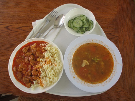 Élénkpiros pörkölt lében kissé egyenetlen méretű, 2-3 cm-es, szabálytalan alakú, élénk rózsaszínű húskockák. A szaft tetején egybefüggő piros színű zsírfoltok láthatóak. A hús nagyjából jól tisztított, de egy-két zsírosabb darab található közte. A köret törtfehér színű, kissé töredezett orsótészta. |