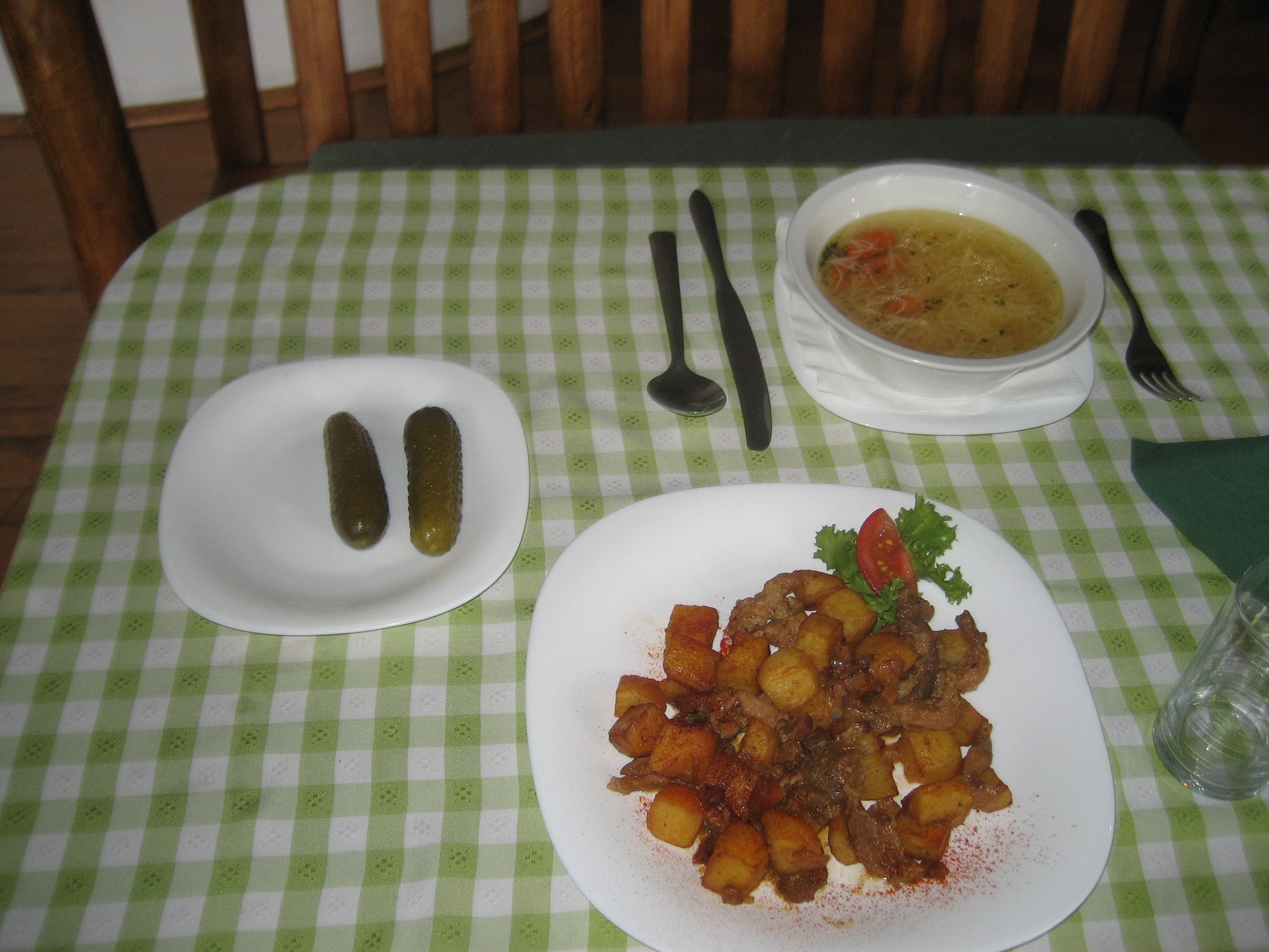 Menü: Húsleves finommetélttel, zöldséggel, Brassói aprópecsenye, Csemegeuborka