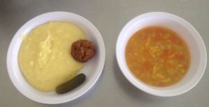 A püré kissé sótlan, vaj íze érezhető benne. A fasírt ízében a hagyma dominál, de egyébként sótlan, íztelen. |