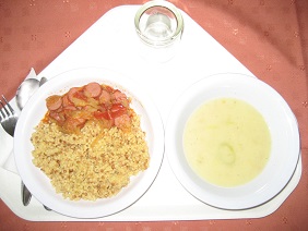 Menü: Hagymakrémleves, baromfipálcikás lecsó tarhonyával