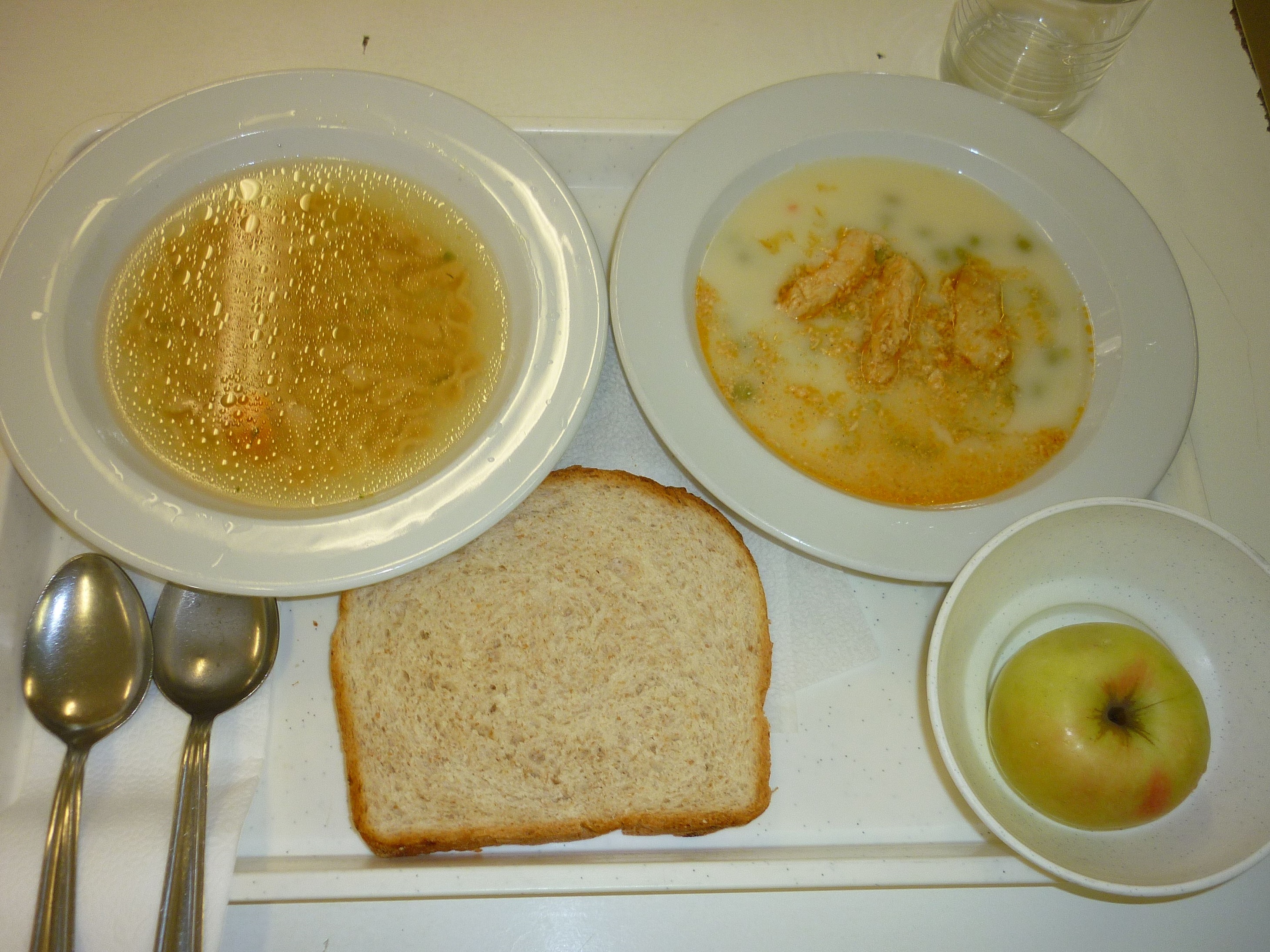 Menü: Csontleves, Zöldborsófőzelék, Fokhagymás csirkemellragu, Alma, Korpás kenyér