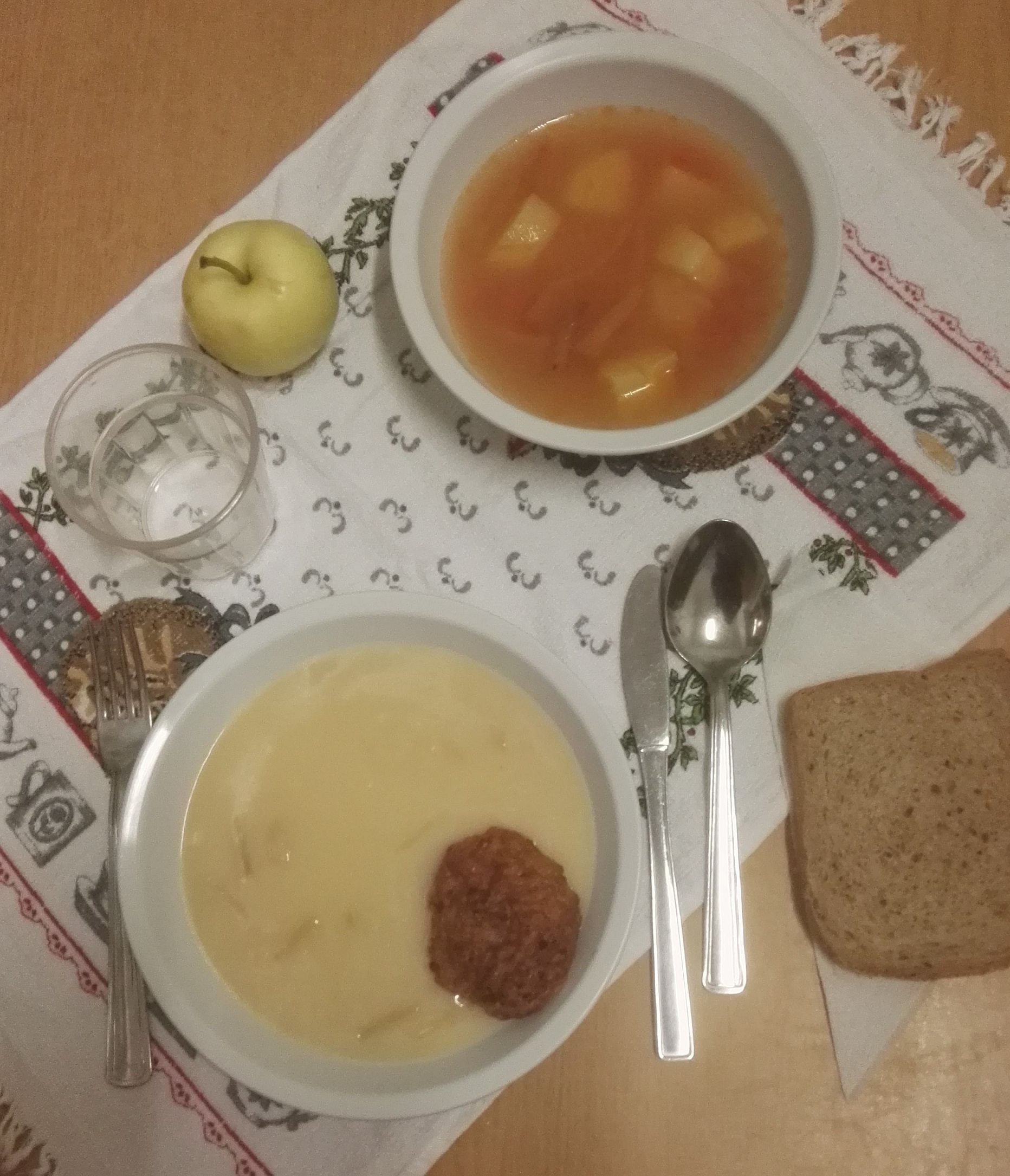 Menü: Magyaros burgonyaleves, Zöldbabfőzelék, csibefasírt, Barna magvaskenyér, Alma