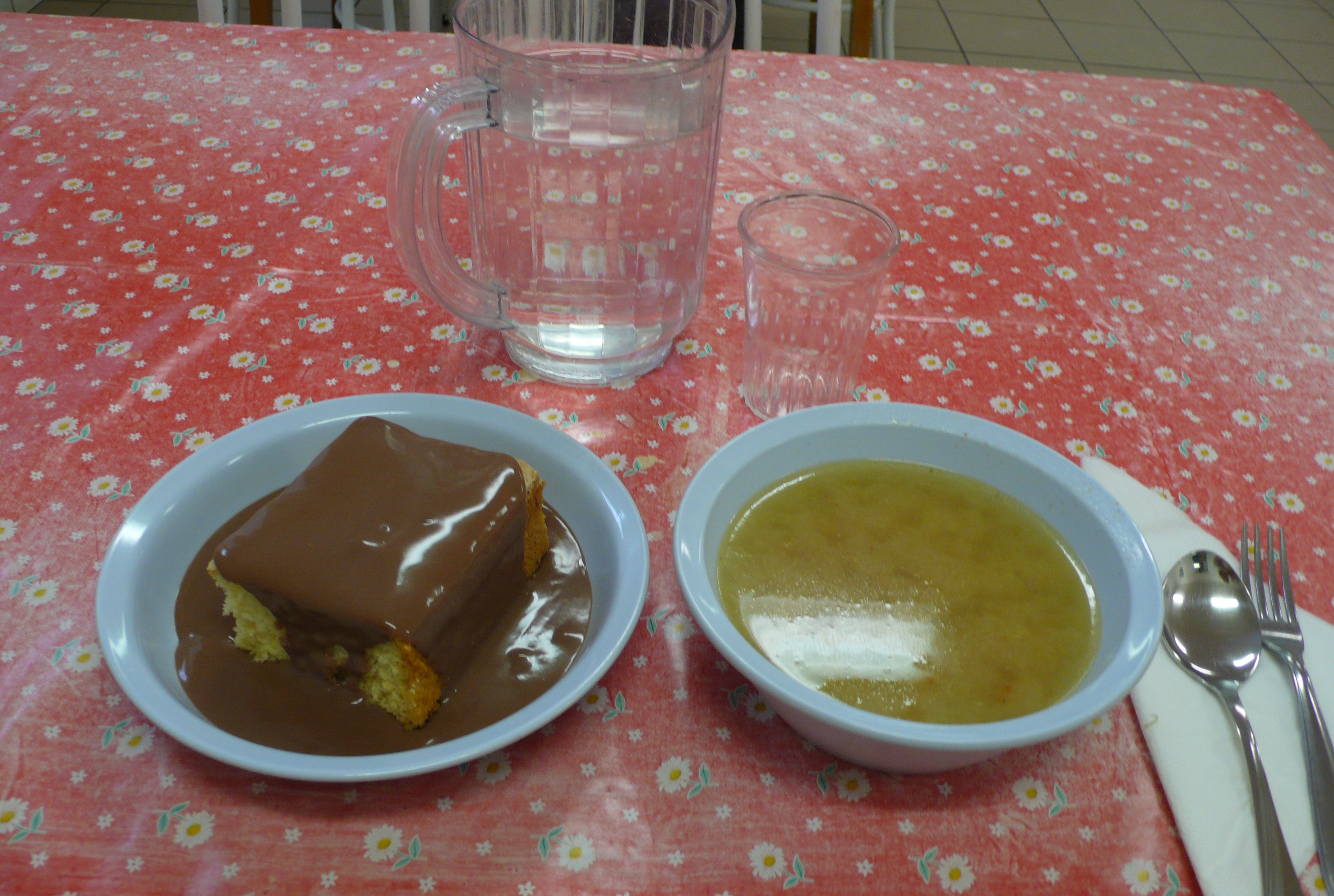 A galuska és a zöldségek túl puhák, túlfőttek. A lé zavaros. A hús kissé rágós. |