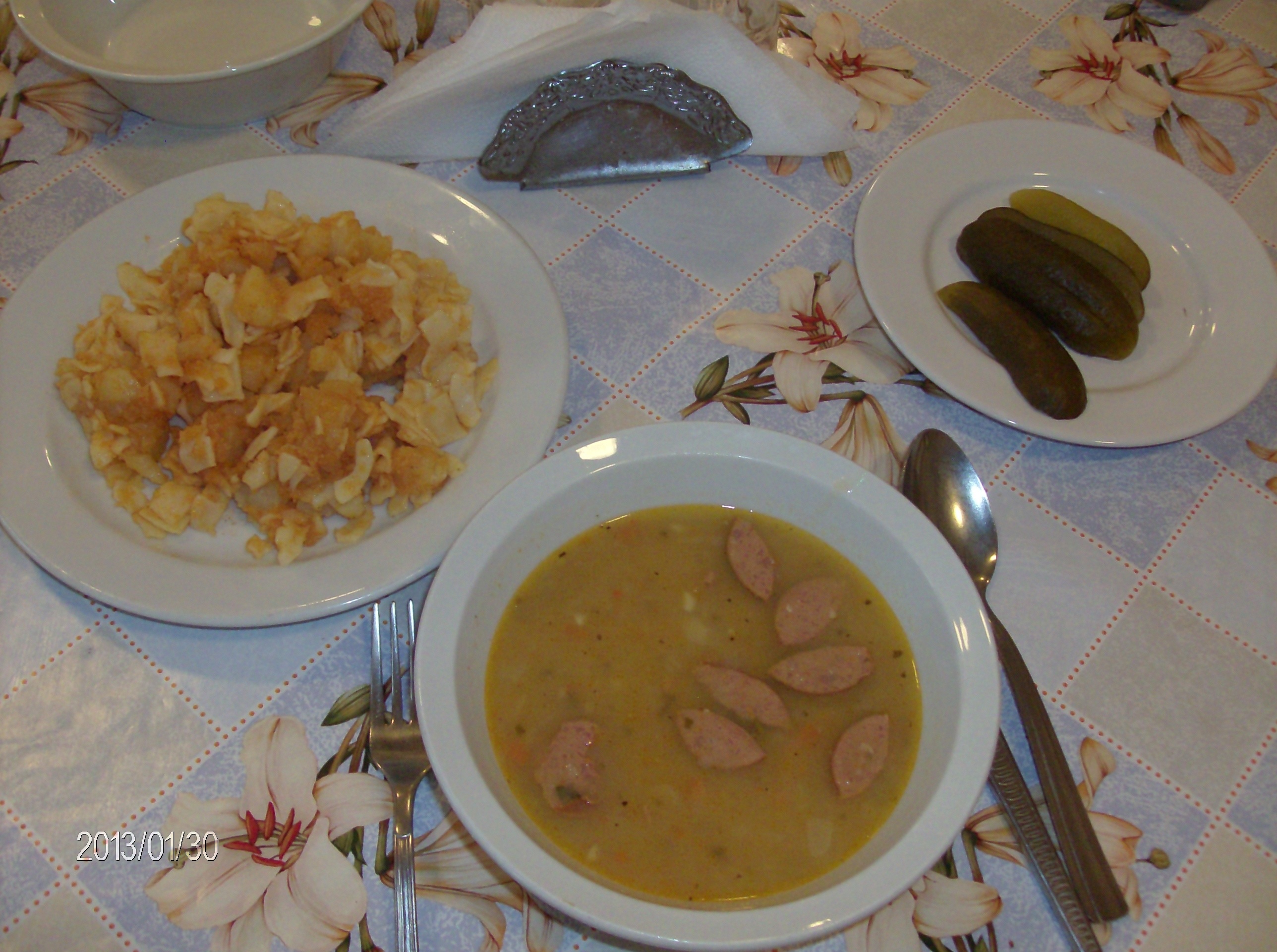 A tészta és a krumpli is vegyes állományú. A tészta többsége puha, túlfőtt, kisebb része kissé kemény. A krumpli egy része pépes, a nagyobb darabok kevésbé puhák. |