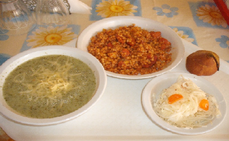 A tarhonya kissé túlfőtt, a krumpli kellően puha, a hús kissé rágós, rosszul tisztított, több mócsingos darab található. |