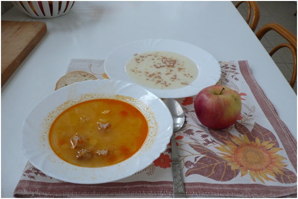 A lé híg, zavaros. A zöldségek és a tészta puha, de nem szétfőtt. A hús kissé kemény, néhol zsíros, mócsingos részek láthatók. |