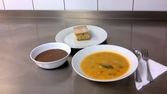 Narancsos- barnás színű, sűrített lében, különböző méretű és színű babszemek, sárga és fehérrépa kockák, csipetke tészta szemek és élénkvörös, részben bőrös füstölthús darabok. A leves alján fekete, piros fűszerszemcsék, tetején zöldfűszer levél foszlányok és fehér pöttyök láthatók. A sok összetevőtől sűrű, tartalmas leves. A zöldségek gondosan tisztítottak. |