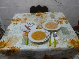 A lé hígan folyó. A burgonya puha, a galuska túlfőtt. A zöldségek gondosan tisztítottak. |