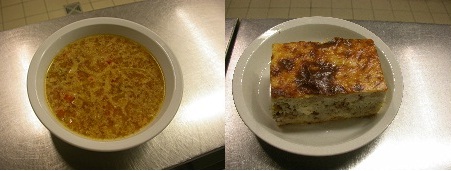 12 x 6 x 6 cm-es téglatest alakú rakott karfiol, tetején aranybarnától-sötétbarnáig terjedő színű sült tejfölös réteg látható. Belsejében szürkésfehér színű karfiol, szürke színű darálthús és fehér színű rizs darabok találhatóak. Sötét színű fűszerszemcsékkel tarkított. |