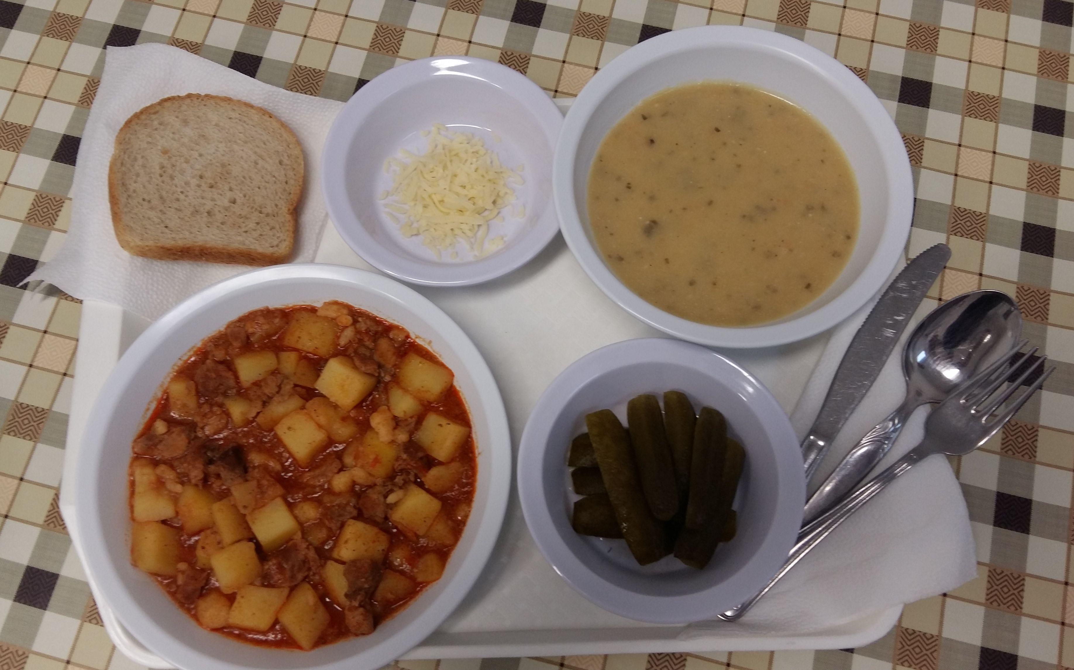 A hús puha, jól átfőtt. A burgonyakockák egy része kissé kemény, nem kellően átfőtt. A galuska puha, kissé mászkos. |