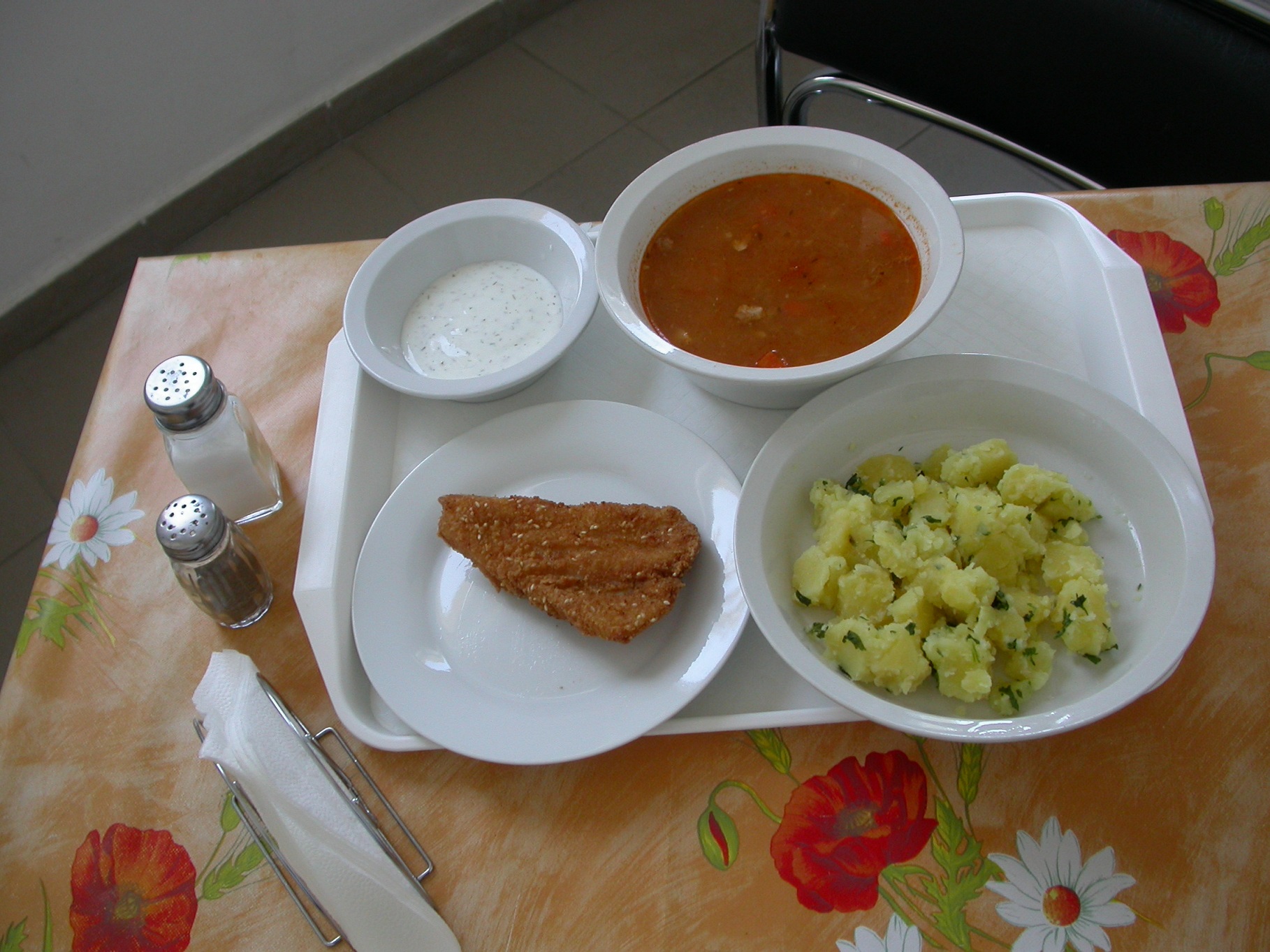 A burgonya kellően átfőtt, puha. A panír ropogós, kissé zsíros érzetű, a halhús kellően átsült, puha. A szósz sűrűn folyó, sima, csomómentes. |