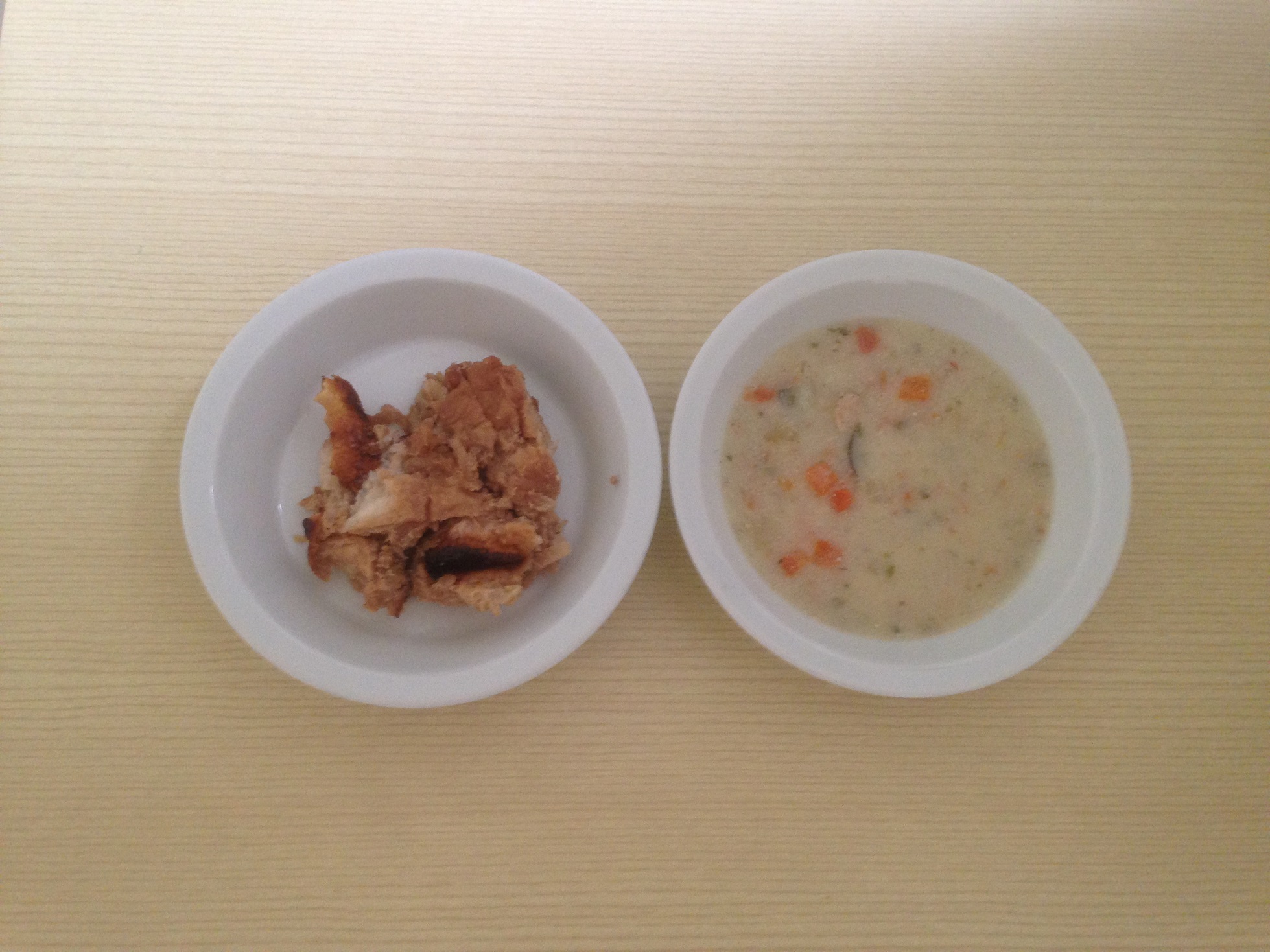 | Külső megjelenés: | Egymásra rétegzett kifli karikákon almaszeletek és diós szórat van egymásra rétegezve. A felső réteg kifli karikára tojásfehérjehabot sütöttek, ami erősen megégett. Az egyik adag ételben belesütött hajszálat találtunk. Az étel undort keltő, égett, idegen anyagot tartalmaz, ezért közétkeztetésben nem felszolgálhatónak minősítettük. Az érzékszervi bírálatot a tapasztalt kizáró tulajdonságok miatt befejeztük a külső tulajdonság bírálata után. |
