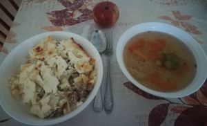 A megközelítőleg 11cm x 16 cm x 4 cm-es hasáb alakban tálalt, tetszetős megjelenésű rakott étel a második fogás. Felületét egyenletesen bevont, pirítási foltokat tartalmazó sült tejfölréteg fedi. Metszéslapján a rétegek jól látszanak, összesültek. A rétegeket jellemző színű, vajszínű fodros nagykockatészta, egyenletesre darált, drappos-rózsaszínes színű, fekete borszemcséket tartalmazó hús, ételízesítőből származó zöldségdarabok, hagymadarabok és törtfehér színű főtt rizs keveréke alkotja. |