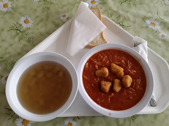 Menü: Húsleves csigatésztával, Paradicsomos káposztafőzelék csirkenuggetsszel és burgonyás kenyérrel