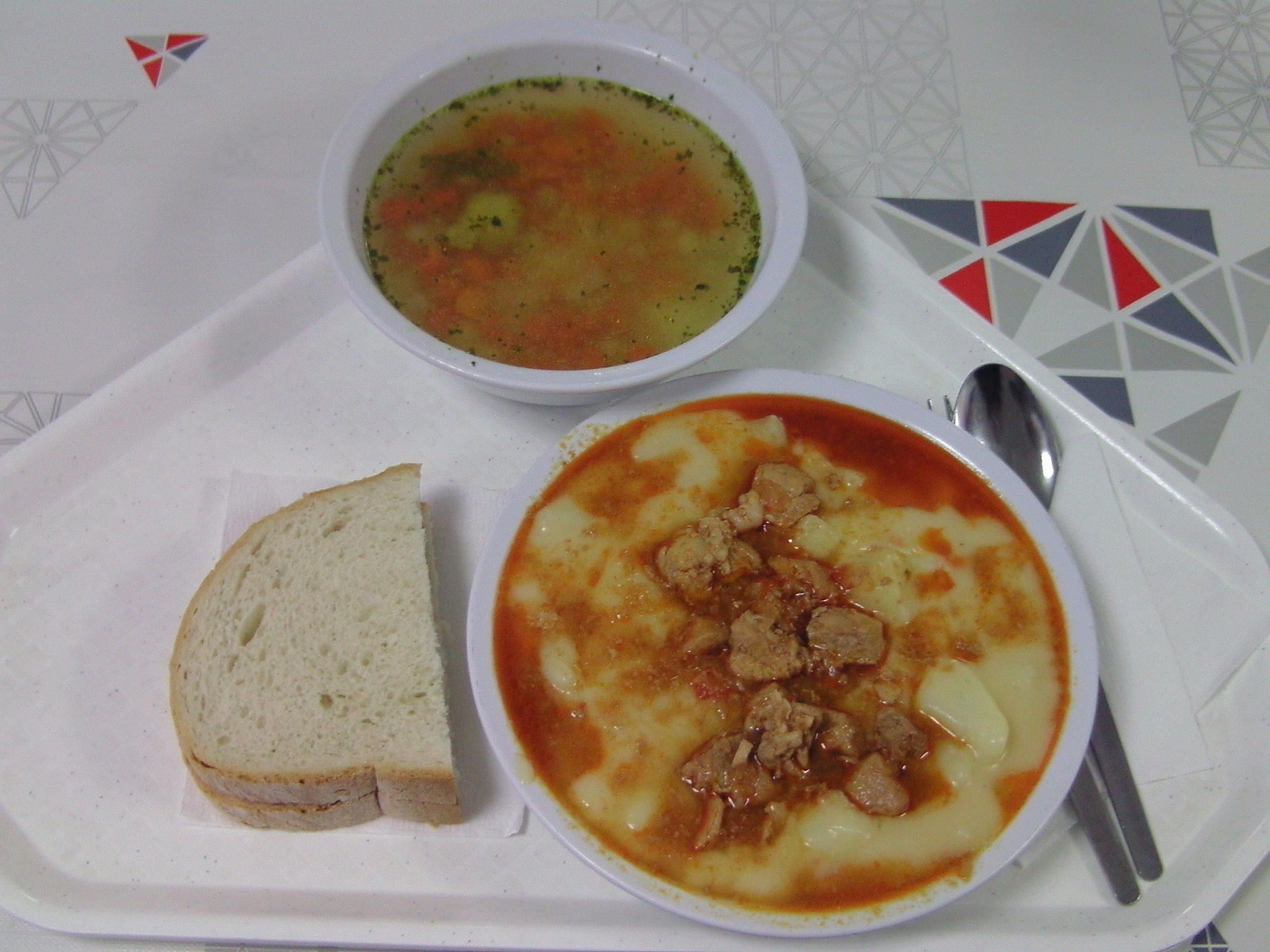 | Külső megjelenés: | Az alapszósz jellegzetes sűrűségű, sárgás színű, zsiradékcseppeket kellő mennyiségben tartalmaz. Láthatók benne zöld fűszernövénydarabok és fekete fűszerszemcsék. A burgonya jól tisztított és közel azonos méretűre kockázott. A sűrítés egyenletesen oszlik el, homogén, csomómentes. A sertéspörkölt szaftja pirospaprikától narancsosra színezett, jellegének nem megfelelő sűrűségű, hígan folyó. Zsiradékcseppeket kellő mennyiségben tartalmaz. A szaftban piros és fekete fűszerszemcsék és piros lecsópaprikadarabok találhatók. A hús világosbarna színű, különböző méretűre kockázott, jól tisztított. A bírált étel elnevezése és megjelenése összhangban van. Idegen anyagot nem tartalmaz. |