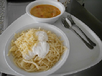 Közel azonos méretű, körülbelül 5 milliméter széles metélttészta. Rajta fehér tejföl, sárga színű reszelt sajt. A tészta és a feltét aránya megfelelő. |