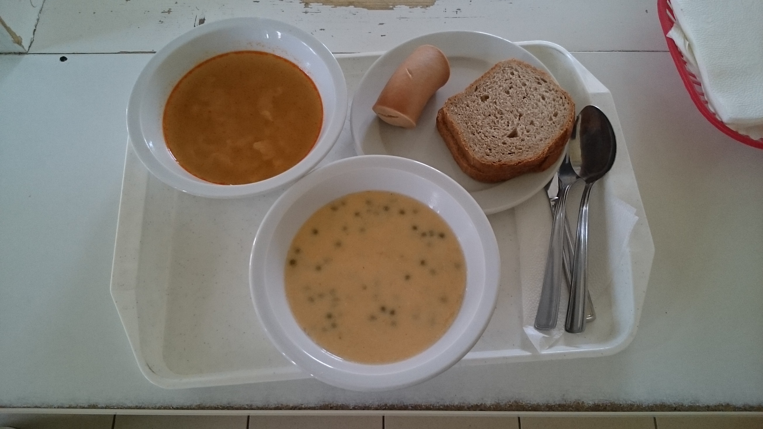 | Külső megjelenés: | Világos, fűszerpaprikától narancsosra színezett csomómentes főzelék alapban a sűrítőanyagból származó fehér pöttyök, több hagymadarab, 1-2 sárgarépafoszlány, egyenletes nagyságú, a zöld különböző árnyalatainak megfelelő színű zöldborsószemek láthatók. A főzelék felületén néhány apró zsiradékcsepp van. A krinolin egy darab 7 cm hosszú, 4 cm átmérőjű, két végén vágott barnás rózsaszínes színű vörösáru. Metszéslapja rózsaszín színű húspép, egynemű, a burkolata tiszta. |