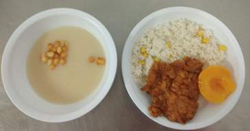 | Állomány: | A rizs pergős, néhol túlfőtt, a kukorica megfelelő állományú. A hús kellően átsült, egyenetlenül, néhol "hajszálvékonyságúra" klopfolt, inas részt is tartalmaz, kissé zsíros érzetű. A panír a húshoz nem jól tapad, néhol felhólyagosodott, elvékonyodott. |