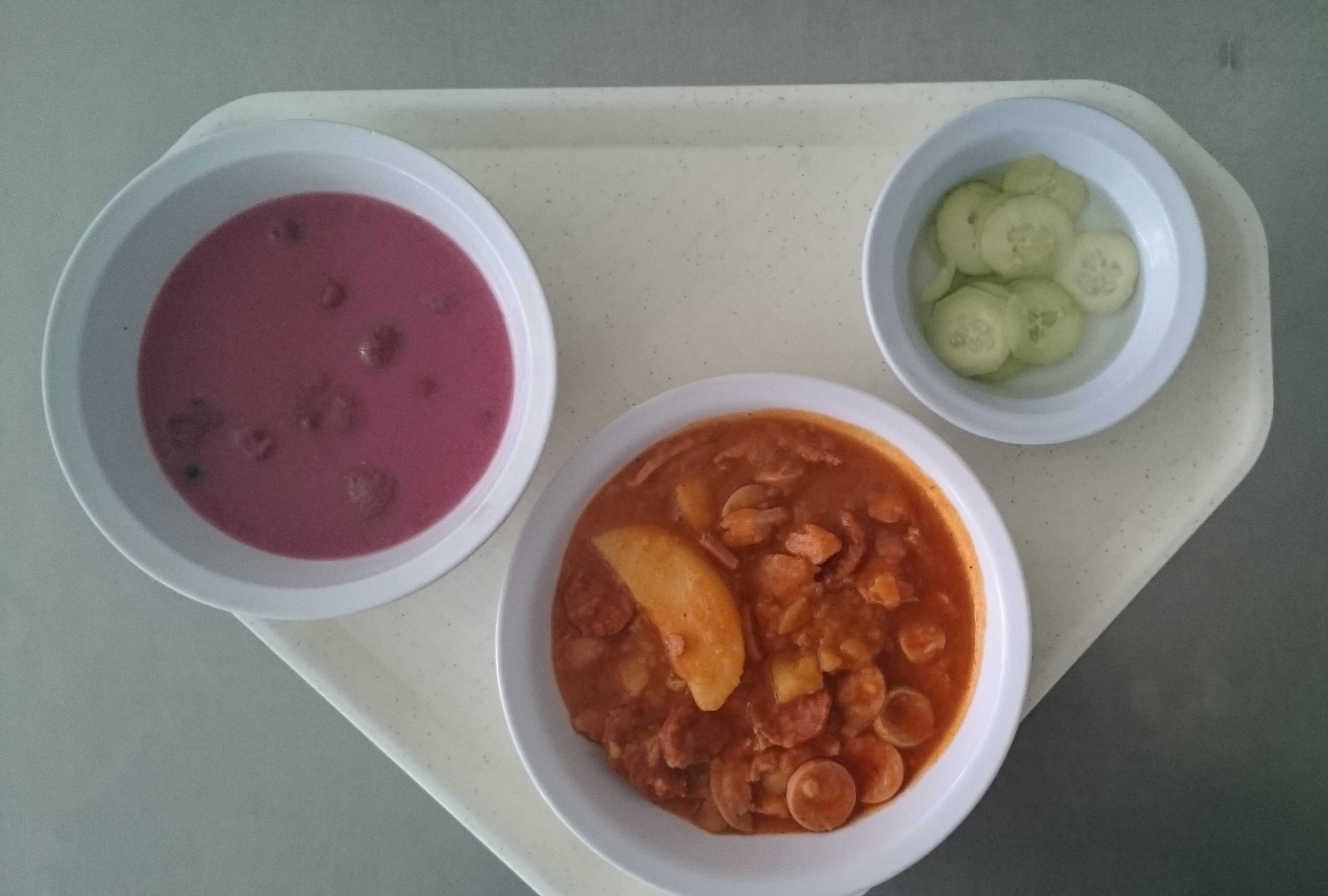 Menü: Gyümölcsleves, Paprikásburgonya virslivel, Uborkasaláta
