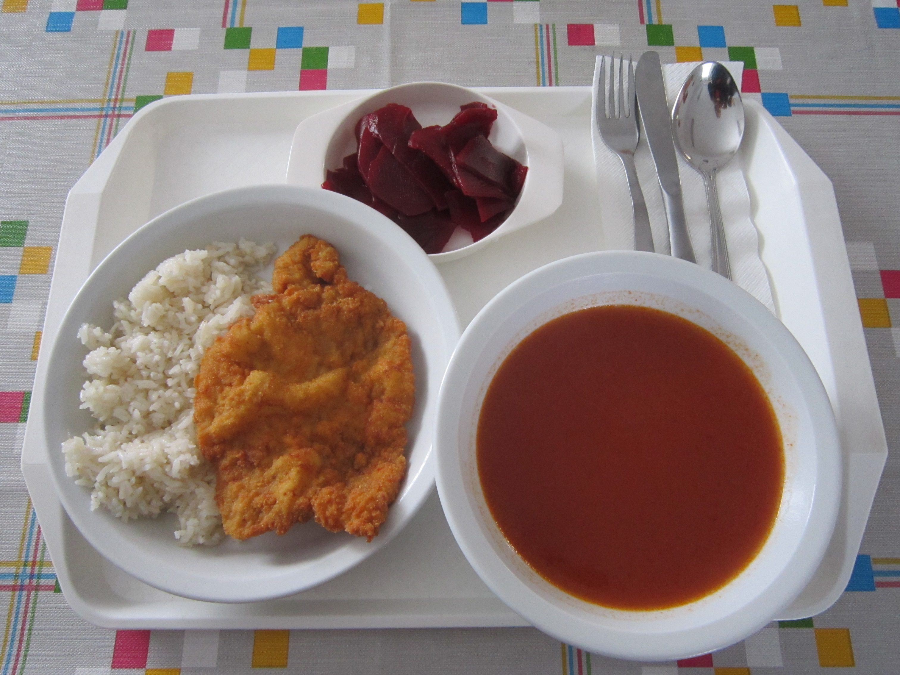 Menü: Paradicsomleves, Rizs, rántott sertésszelet, Cékla