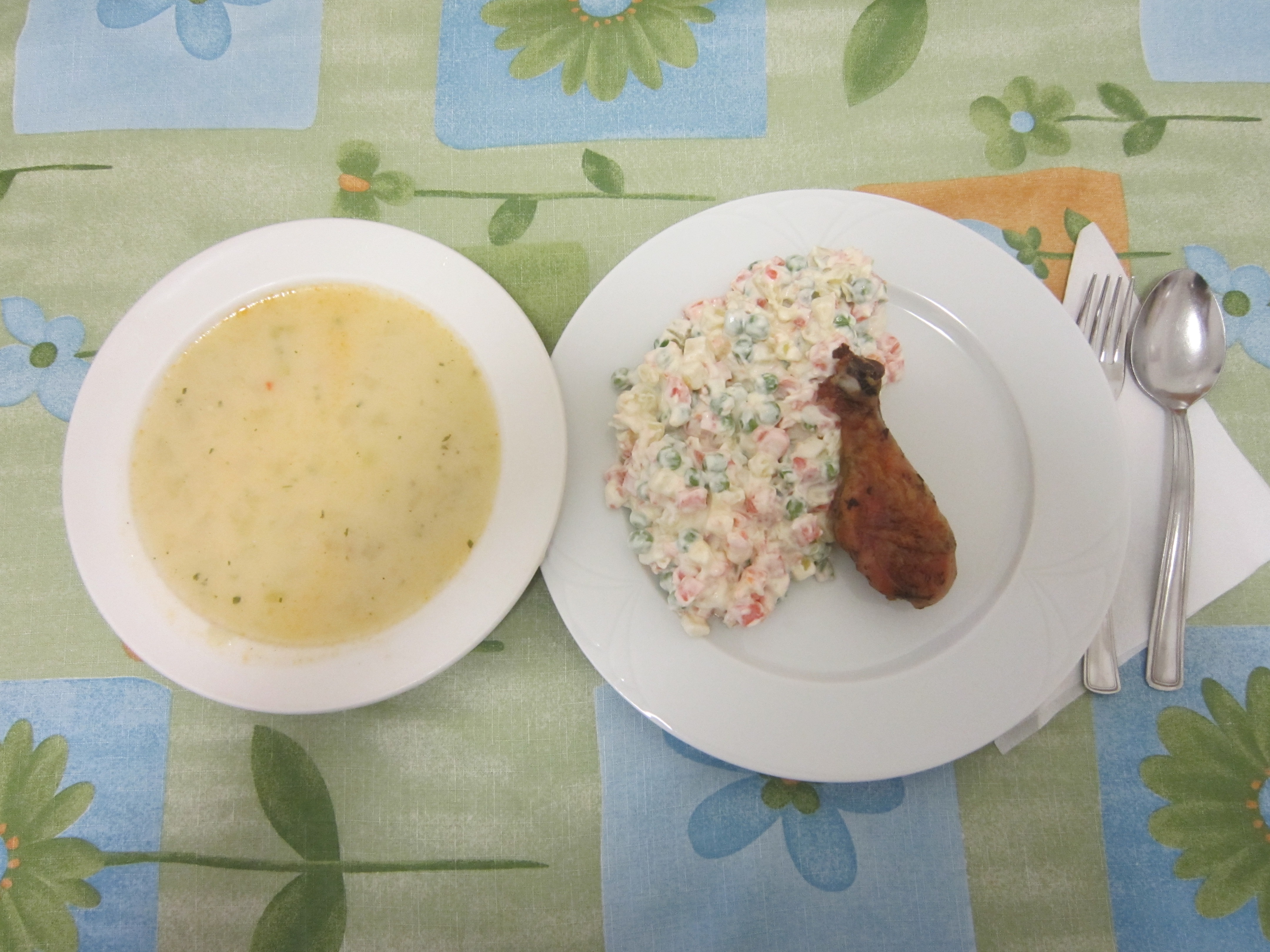 Menü: Karalábé leves, Zöldfűszeres csirkecomb, Francia saláta