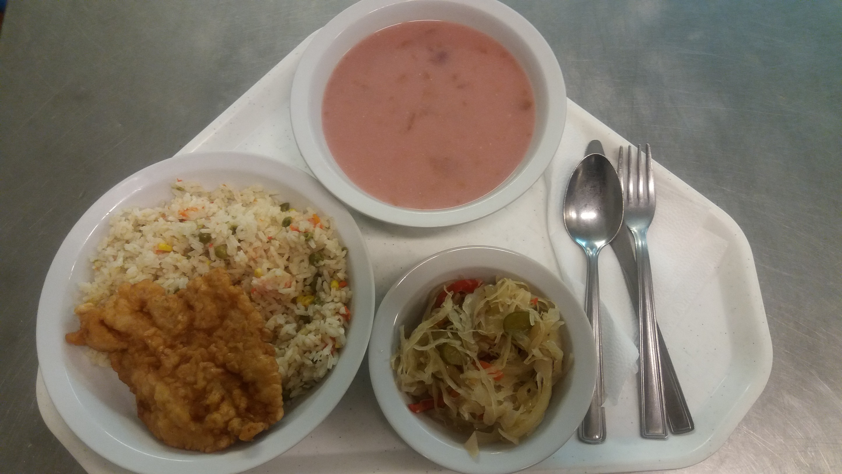 | Állomány: | Rizs: Egyenletesen átfőtt, kissé ragacsos, könnyen rágható, nem zsíros. A zöldségek kellően puhák. Párizsi csirkemell: A bundázás ropogós, de kissé olajos. A hús kellően átsült, puha, jól rágható. Az egyik szelet hús apró csontszilánkot tartalmazott. |