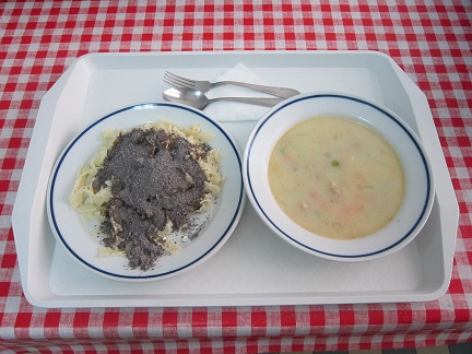 Becsinált leves Sertés comb Olaj Rama Habtejszín Liszt Fekete őrölt bors Só Ételízestő Burgonya Gyökér Sárgarépa Petrezselyem zöld Zöldborsó (mirelit) Citromlé Mákos tészta Zsír Olaj Csusza tészta Porcukor Só Mák