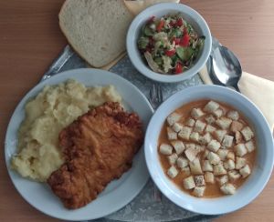 Menü: Köménymagleves kenyérkockával, Pulykamellfilé orly-módra burgonyapürével, vegyesvágottal és kenyérrel