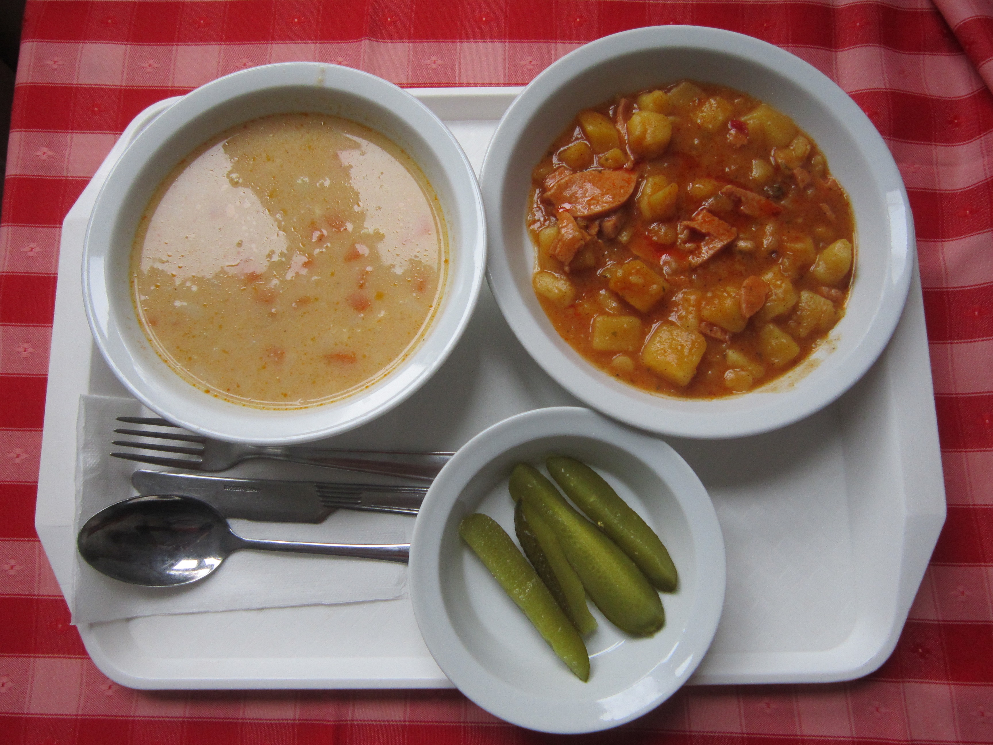 A szaft sűrű, a burgonya és a lecsókolbász egyenetlen méretű, de kellően átfőtt. |