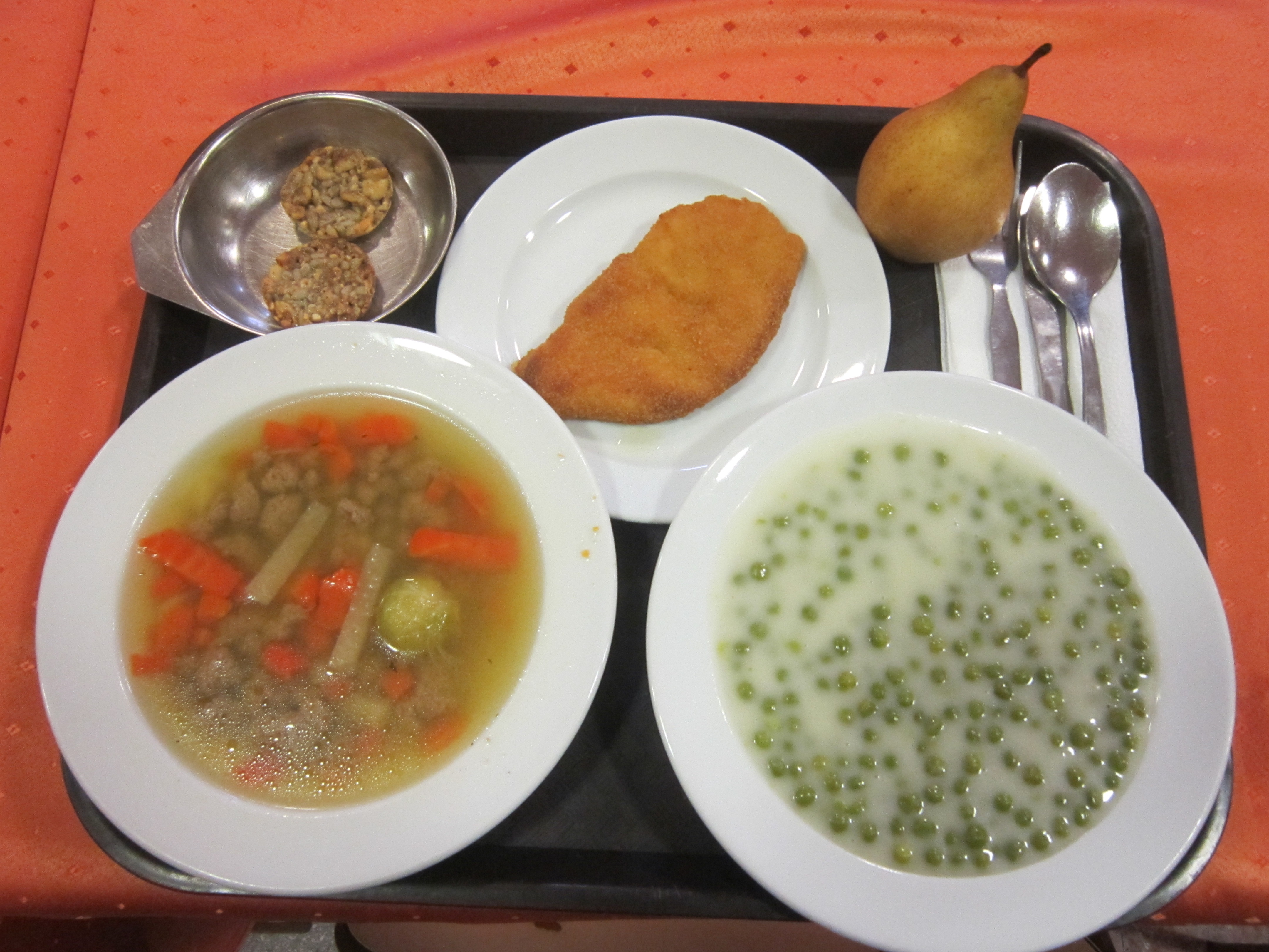 Májgaluska leves Csont vegyes Sertésmáj Sertés zsír Tojás Liszt Zsemlemorzsa Zsemle Fűszerpaprika Majoranna Só Ételízesítő Gyökér Karalábé Kelkáposzta Petrezselyemzöld Sárgarépa Vöröshagyma Zöldborsófőzelék Olaj Tej 1,5% Liszt Kristálycukor Só Petrezselyemzöld mirelit Zöldborsó mirelit |