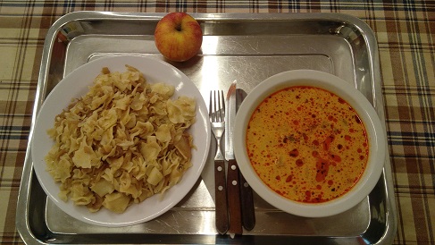 A tészta kissé ragadós, összetapadt, jól átfőtt, de a néhány összeragadt csomó közepe kemény. A káposzta kellően pirított. |
