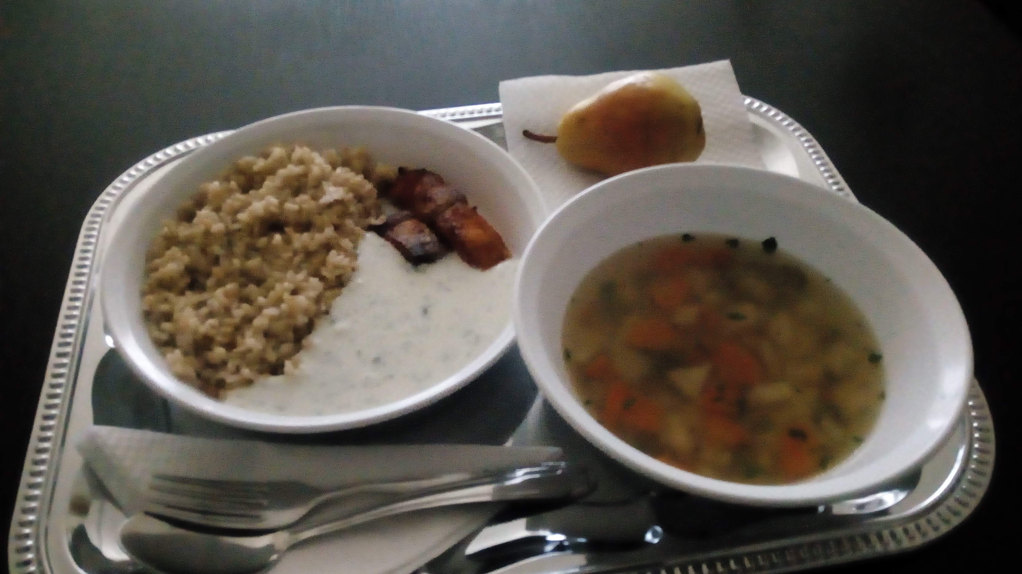 Menü: Zöldségleves, Roston sült hal, kapros-citromos mártás, barnarizs, Körte