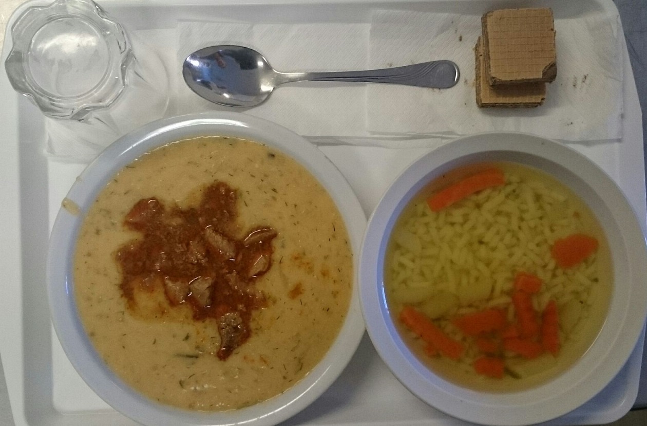 | Állomány: | A lé hígan folyó, a zöldségek közül a petrezselyemgyökér túlfőtt, a levesbetétként tálalt tészta kissé ragacsos. |