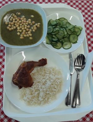 A rizs átfőtt, pergős, de nagyon száraz, a kisebb csomók villával szétnyomhatók. A csirkecomb átsült, a töltelék homogén, masszaszerű. |