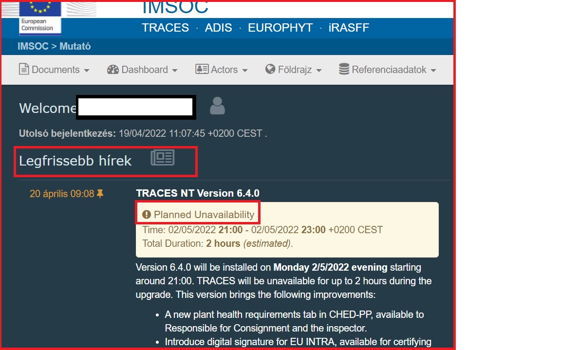 Az előre tervezett üzemszünetekről a Bizottság két héttel korábban tájékoztatja a felhasználókat a TRACES Classic és TRACES-NT felületén keresztül. Kérjük, kísérjék figyelemmel az érintett honlapok nyitóoldalát!