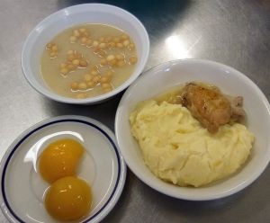 Menü: Zellerkrémleves, Sült csirkecomb parasztosan burgonyapürével, Hámozott, felezett őszibarack cukrozott lében