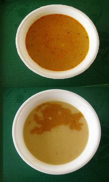 Pirospaprikától színezett narancsos-drapp lében apró burgonyakockák, kevés zöldség darabka, pirított fodros kockatészta, aprított zöldfűszerek. Tetején narancsszínű zsírcseppek. |