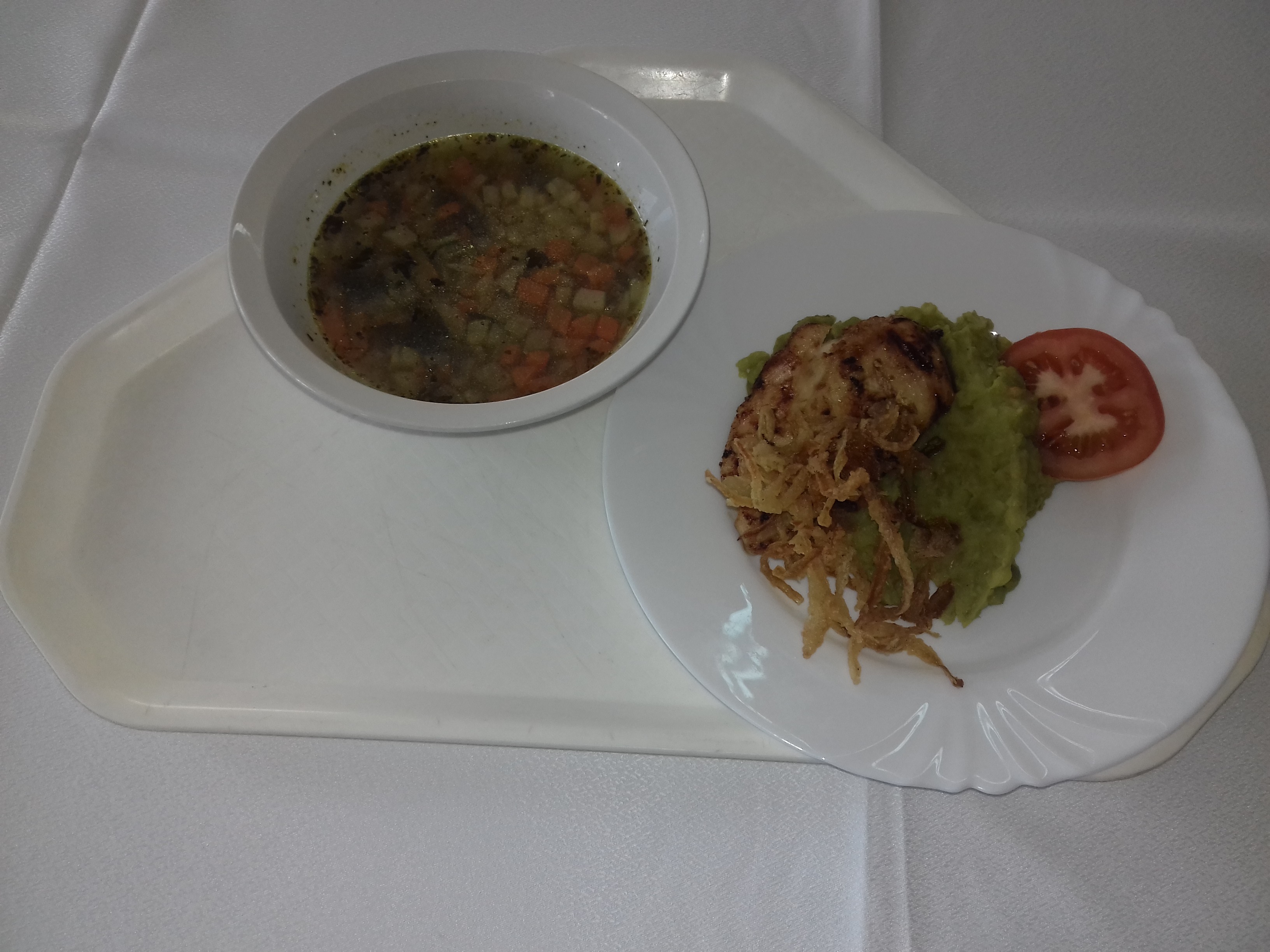 Kb. tenyérnyi méretű rózsaszín árnyalatú szürkésfehér csirkemell szeleten eltérő vastagságú, aranysárgára pirított hagymacsíkok. A köret világos zöld színű tört zöldborsó burgonyapürével keverve. A püré kevésbé jól pépesített. Nagyobb burgonya darabkák és zöldborsó héj érzékelhető. |