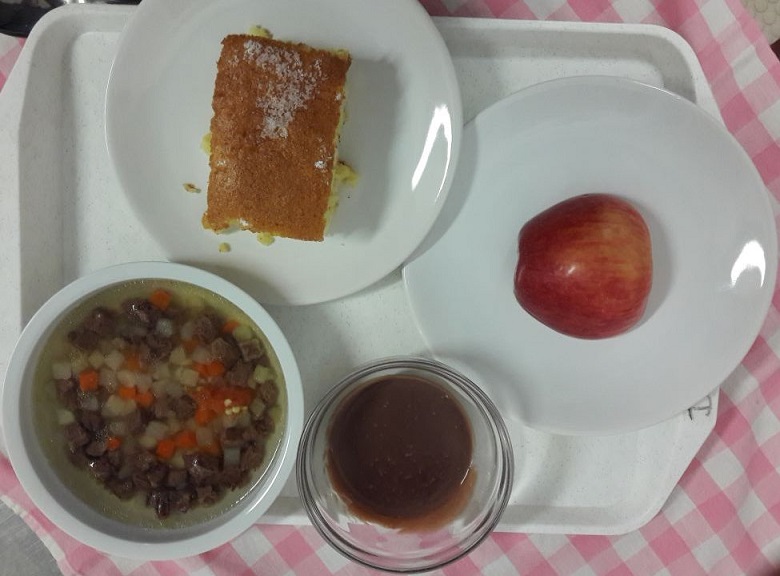 | Állomány: | Az alaplé hígan folyó, a hús megfelelően puha, a zöldségek kissé túlfőttek. A tészta kellően átfőtt. |