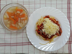 A halomban kínált vajszínű spagetti tészta tetején rátétként narancsos-pirosas színű, zsiradékcseppeket tartalmazó szószban barnás színű darálthús, apró üveges színű hagymadarabok és zöldfűszerdarabok láthatók. Szóratként sárga színű reszelt sajtot adtak, ami a mártás tetején megolvadt