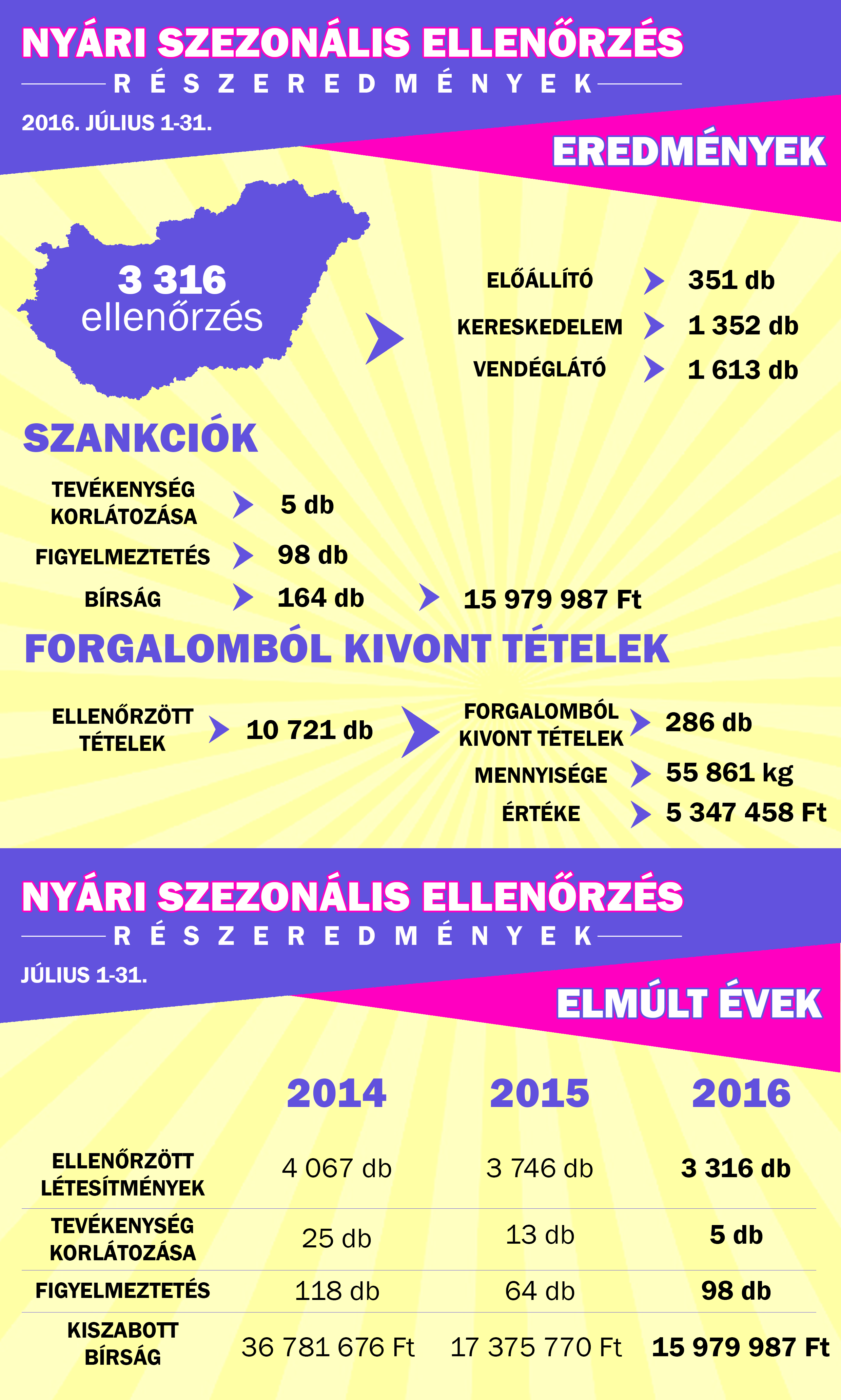A nyári szezonális ellenőrzésen a szakemberek vizsgálták a fagylaltokat, a fűszerezett, pácolt előkészített húsokat, a sült halakat, és a gyümölcsök közül főként a görögdinnyét. Az államtitkár beszámolója szerint a nemzetközi szakmai szervezetek felhívására az ellenőrzött termékek körét kiterjesztették a tojásra, a külföldi UHT tejekre és a vásárokon kapható konyhai kerámia termékekre is.