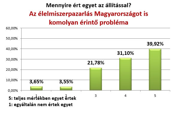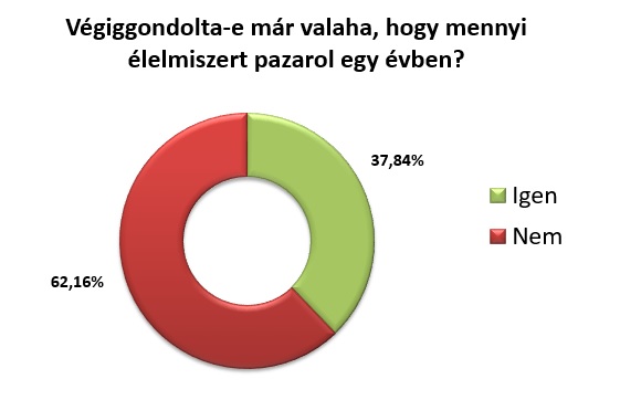 A kérdőíves felmérésből származó eredmények szerint a jelenség felismerése megtörtént, hiszen a válaszadók meghatározó hányada az élelmiszerpazarlást egy Magyarországot is komolyan érintő problémának tekinti, azonban saját háztartásuk szintjén csak kevesen (37,84%) gondolták már végig, hogy ténylegesen mennyi élelmiszert is pazarolnak egy évben.