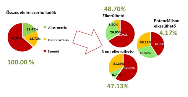 Érdekesség, hogy az elkerülhető élelmiszerhulladékok esetében (amelyeket ténylegesen élelmiszerpazarlásnak hívunk) a legmagasabb azon anyagok aránya (66,25%), amelyek végül szemétként végezik. Ez sokkal rosszabb arány, mint ami például a nem elkerülhető élelmiszerhulladékok esetében figyelhető meg (59,8%). Vagyis a feleslegesen megvásárolt, vagy a helytelen tárolás miatt megromlott élelmiszerek megsemmisítése ráadásul a legkörnyezetterhelőbb módon történik.