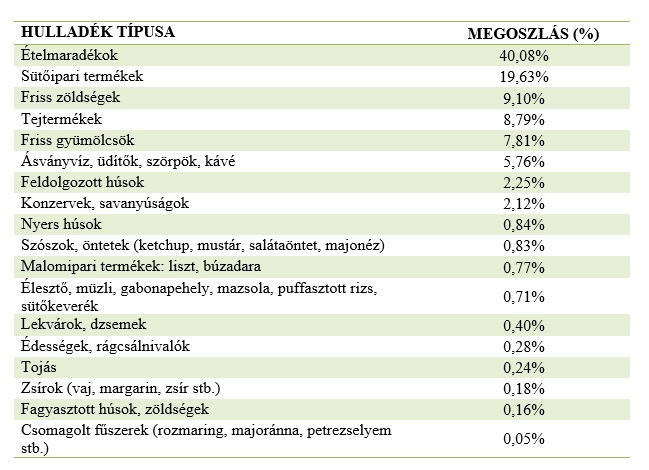 A felmérés alapján elmondható, hogy a legmeghatározóbb elkerülhető élelmiszerhulladék a kész ételekből megmaradt ételmaradék (40,08%). Itt fontos kihangsúlyozni, hogy ennek közel 43%-a folyadék halmazállapotú volt (pl. leves, öntetek).