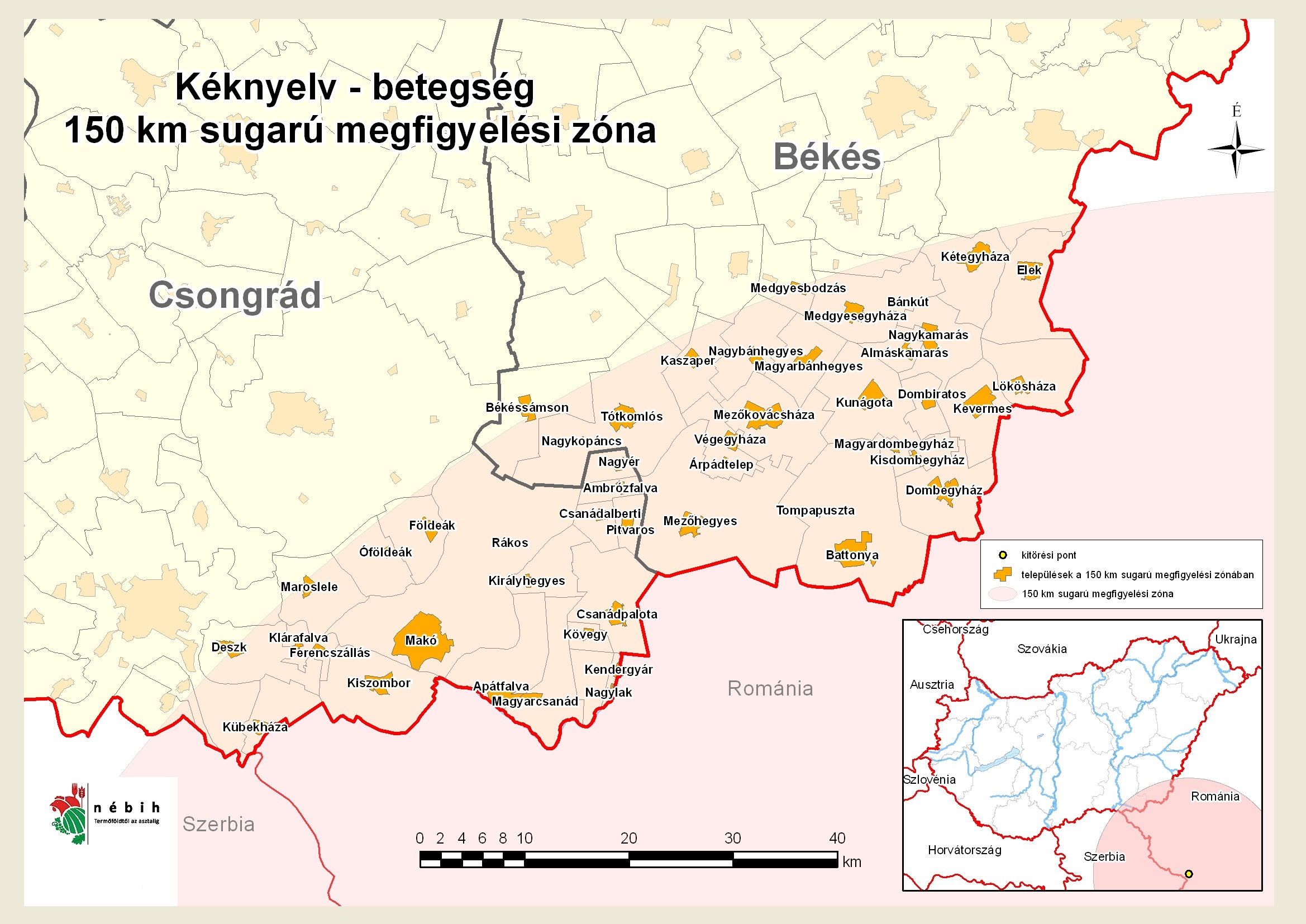 A betegség megjelent Krassó-Szörény megye két településén is. A jelenlegi legközelebbi kitörés körül uniós jogszabályok szerint meghatározott, csak Románia területét érintő, 100 km-es sugarú védőkörzeten 50 kilométerrel túlterjedő megfigyelési körzet magában foglalja Csongrád megye Makói, Hódmezővásárhelyi és Szegedi járásának és Békés megye Gyulai, Orosházi és Mezőkovácsházi járásának egyes részeit. A megfigyelési körzetet elrendelő határozat, az érintett települések listája és térképe elérhető a NÉBIH honlapján.