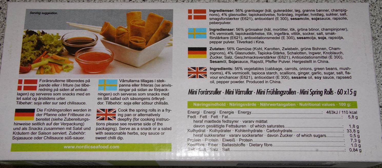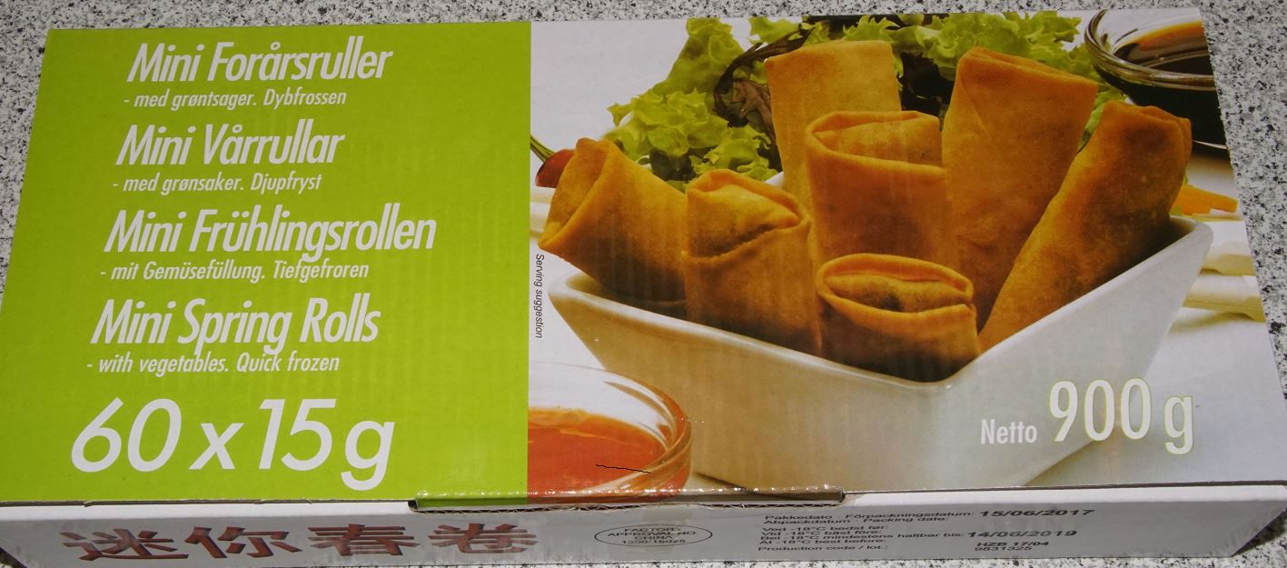 A dán hatóság jelzése alapján nem jelölt glutén összetevőt tartalmazó fagyasztott, mini tavaszi zöldséges tekercset szállítottak Magyarországra. A gyártói önellenőrzés során kiderült, hogy a termék egységcsomagolásán a búzaliszt összetevő nincs feltüntetve, a kötelező jelölés csak a gyűjtőcsomagolásokon szerepel. A Nemzeti Élelmiszerlánc-biztonsági Hivatal (NÉBIH) a RASFF-on keresztül értesült az esetről.
